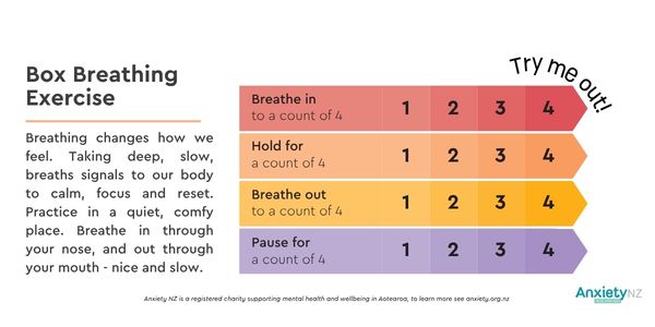 Box breathing is a simple tool that can be helpful for many people. You might like to share it with whānau, family, or friends so they can use it too.
