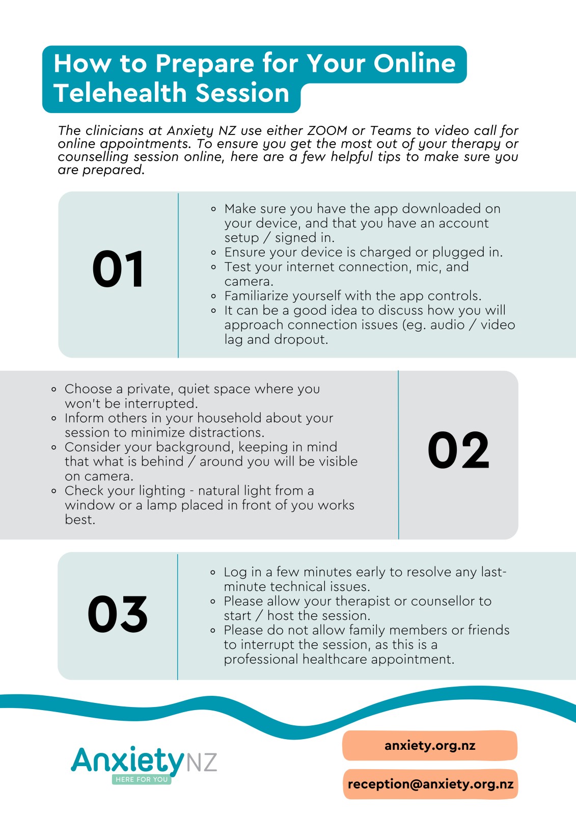 The clinicians at Anxiety NZ use either ZOOM or Teams to video call for online appointments. We will confirm this with you when scheduling your appointment.